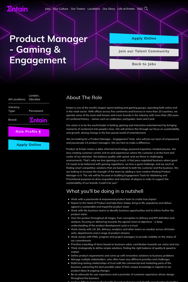 Product Manager Gaming Engagement Job At Entain Group In Gibraltar 58374599 Tapwage Job Search